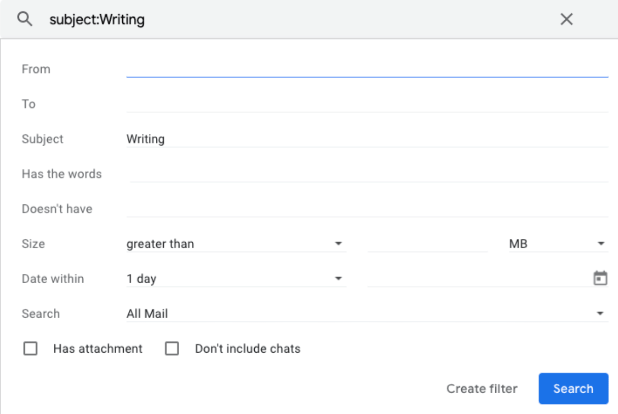 - Click on the “Show search options” to the right, in the Gmail search bar