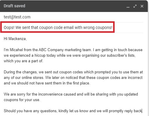 The user will first see the subject line. Thus, you need to make sure that your apology starts from there to immediately clarify the purpose and increase the chances of the user reading your email. Admitting the fault can prove effective.
