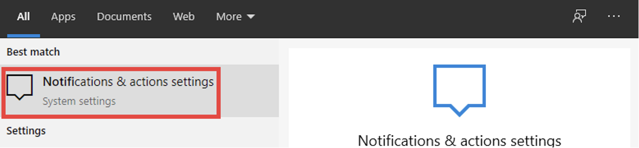 Press the Windows key (Windows 10) and search for “Notifications & actions settings.”