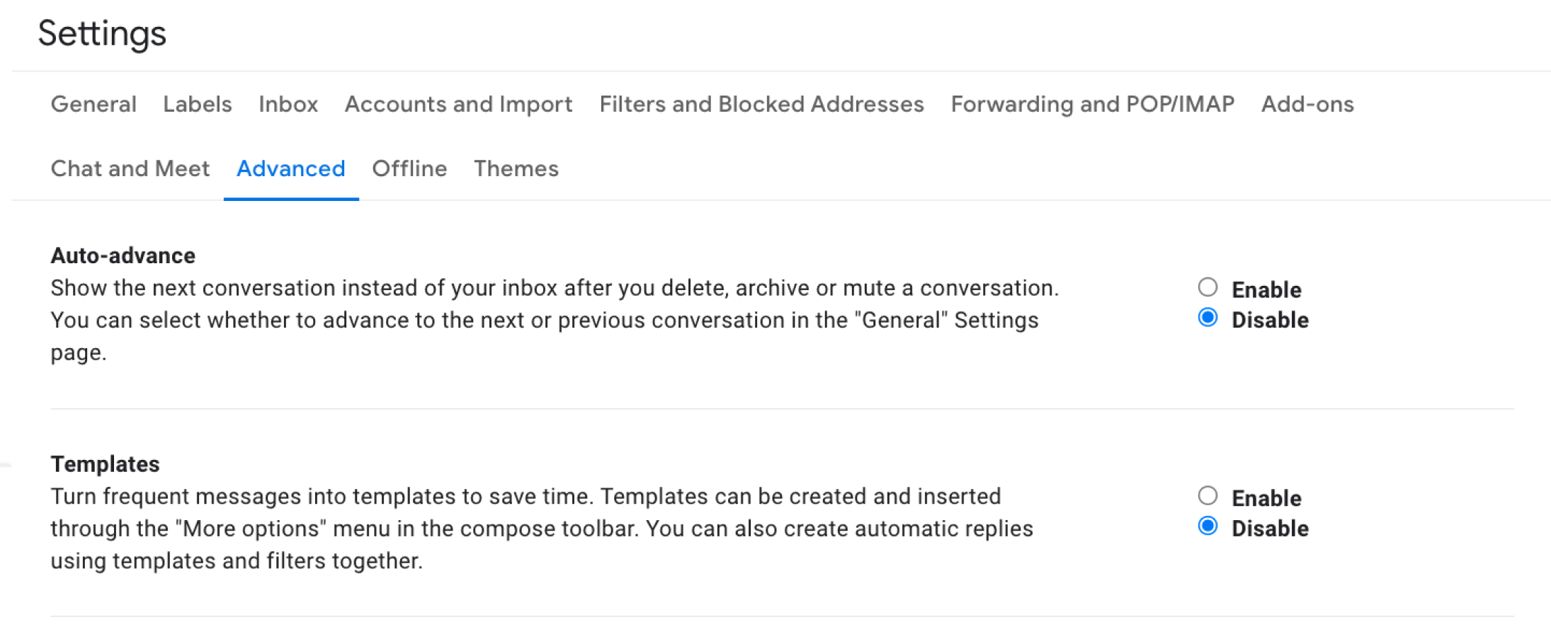 Step 2: Navigate to the Advanced tab, locate Templates and click on Enable