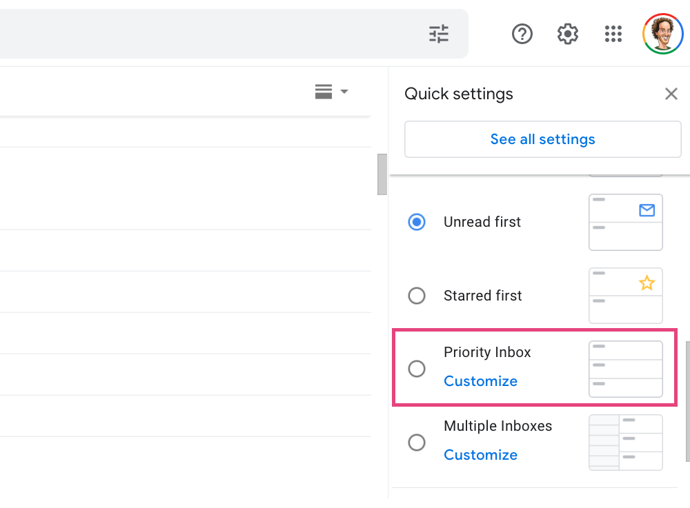 Step 2: Scroll to the bottom until you reach the section labeled “Inbox Type” and choose “Customize” found under the priority Inbox option