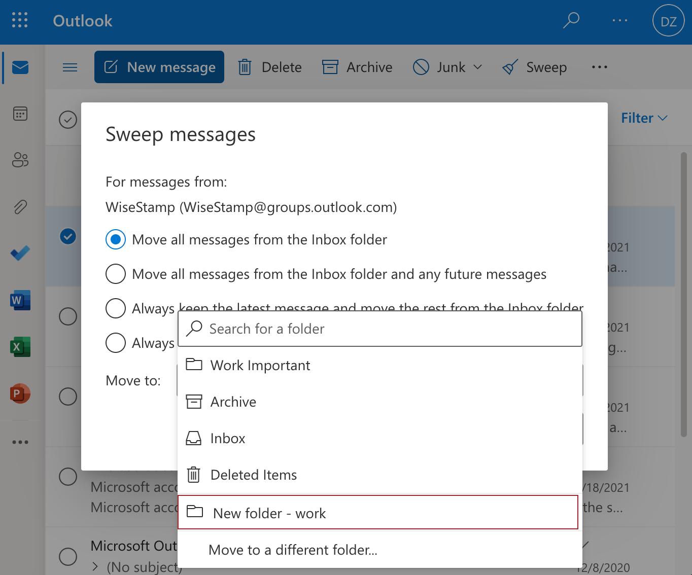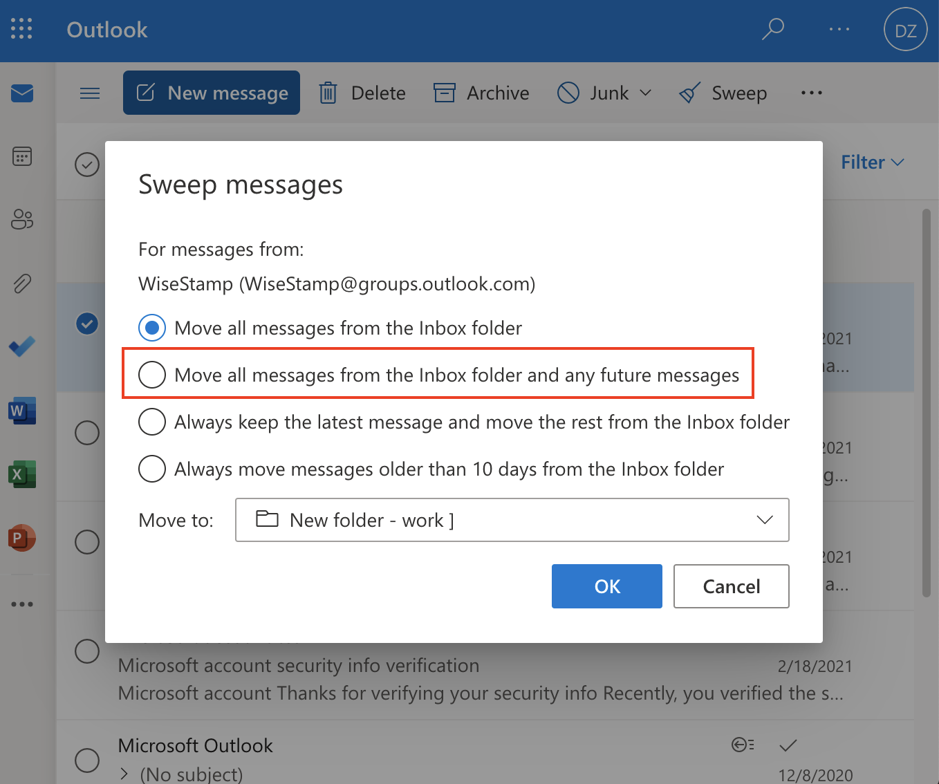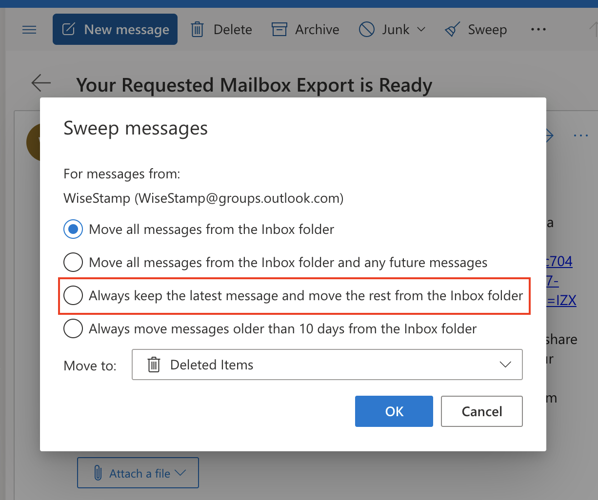 When you click on the Sweep feature in Outlook web, you get to see various rule options that you can run. At this stage, you can decide the action that you would like to execute.