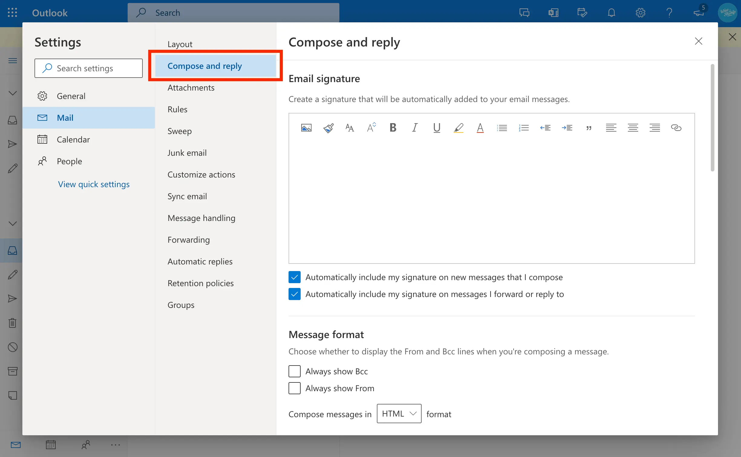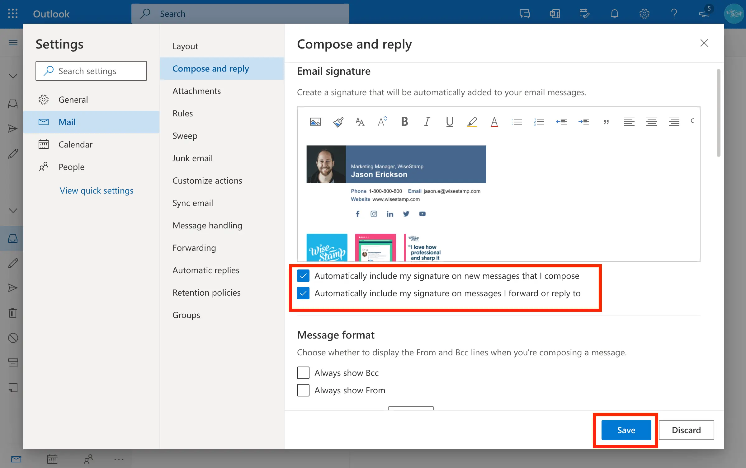 - To set your signature to appear automatically make sure that the 2 default signature checkboxes for “new messages” and for “forward or reply” are checked (Outlook should check them as default option).